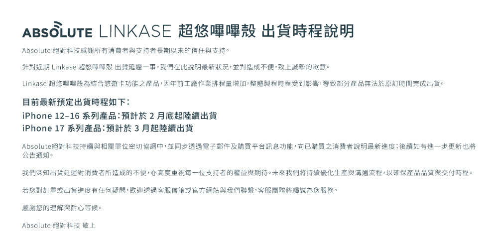 3.因個人使用環境及習慣不同,無法保證您使用的商品完全不變色不髒汙,手機殼為消耗性商品,恕不提供破裂/刮痕/變色...等人為保固服務,謝謝您!